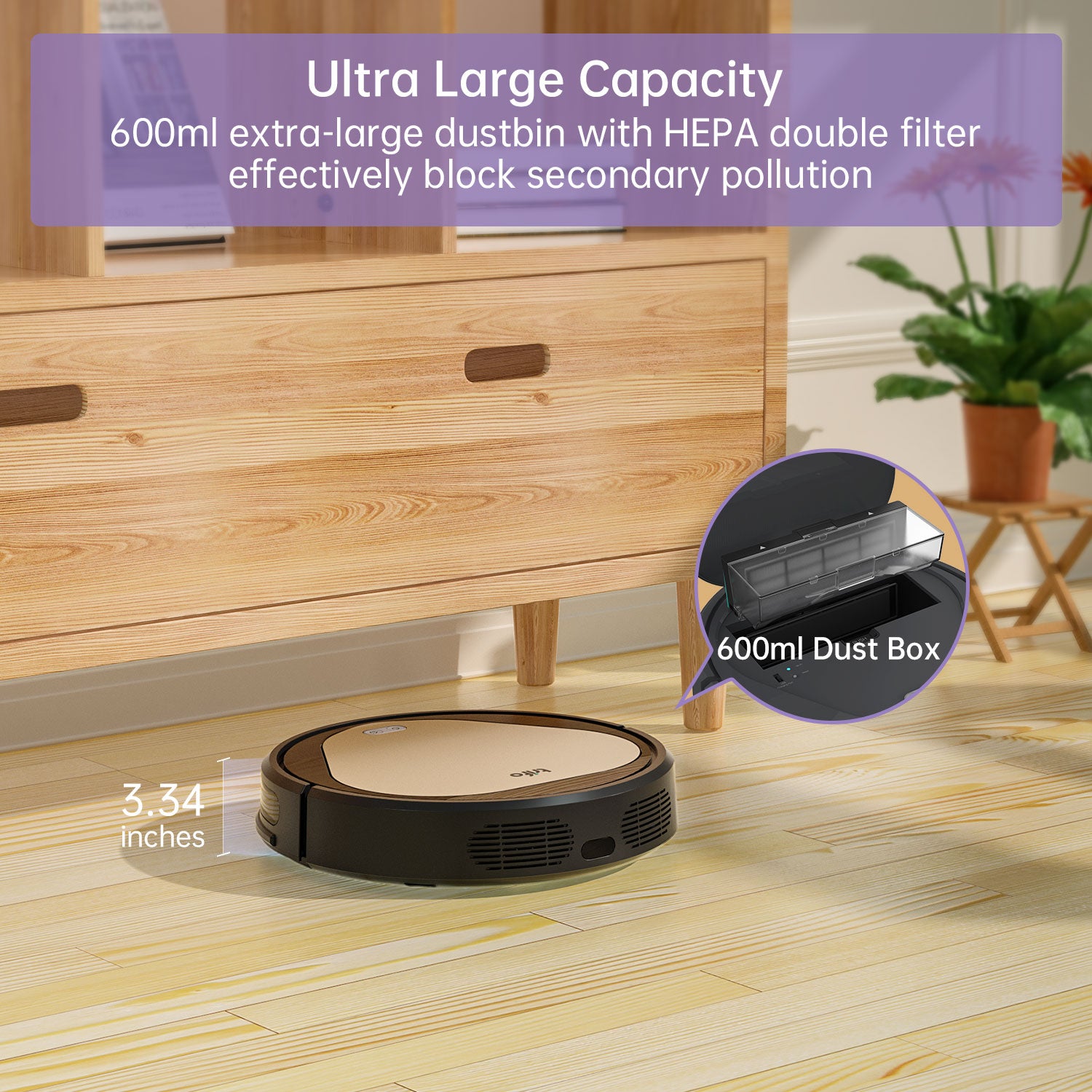 The 3.34-inch ultra-thin automatic vacuum cleaner can easily remove the hard-to-reach debris, dirt, and pet hairs hidden under beds and sofas higher than 3.8 inches correspondingly, which serves as a perfect assistant in your life.